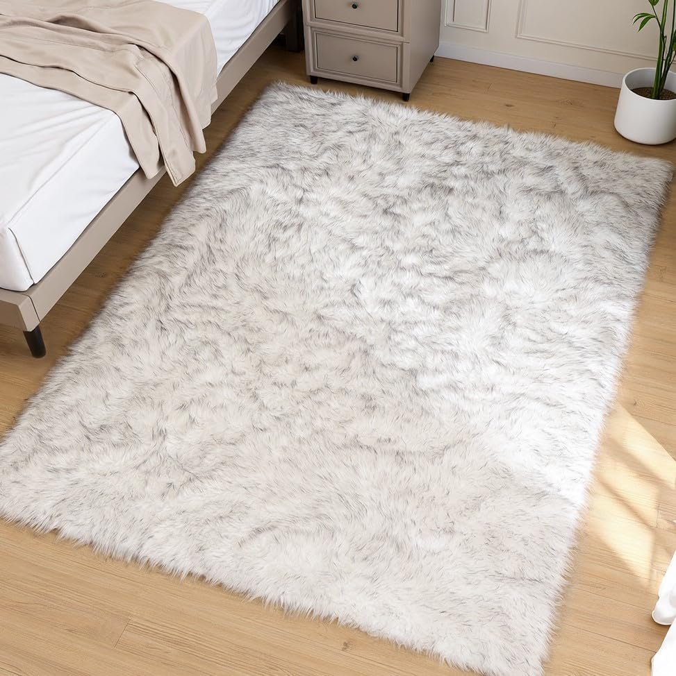 Goolela Faux Sheepskin Fur Rug for Bedroom White with Grey Tips